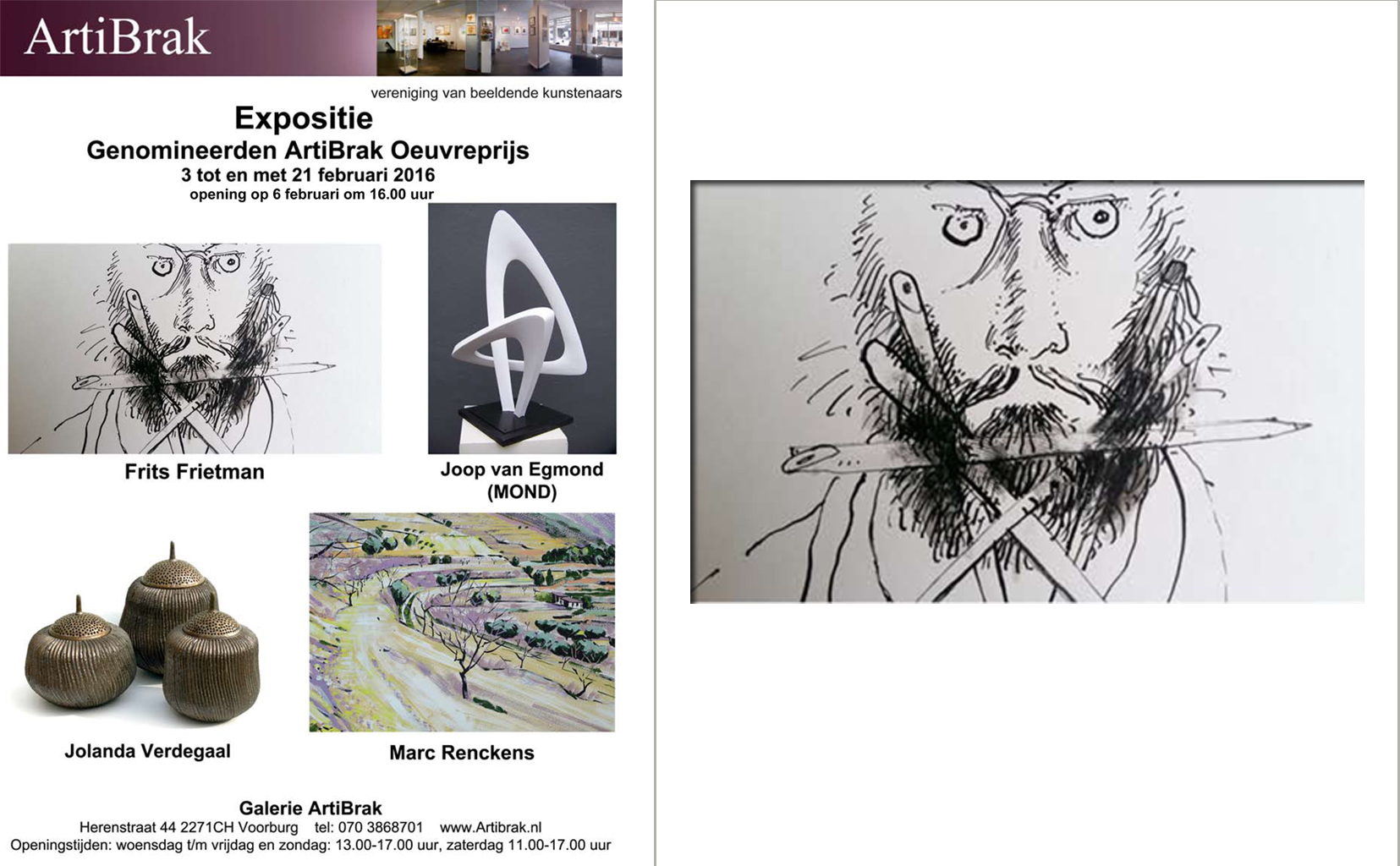 Expositie van de genomineerden van de ArtiBrak Oeuvreprijs 2016 van 3 t/m 21 feb 2016.Deelnemers: Frits Frietman (winnaar genomineerden), Joop van …